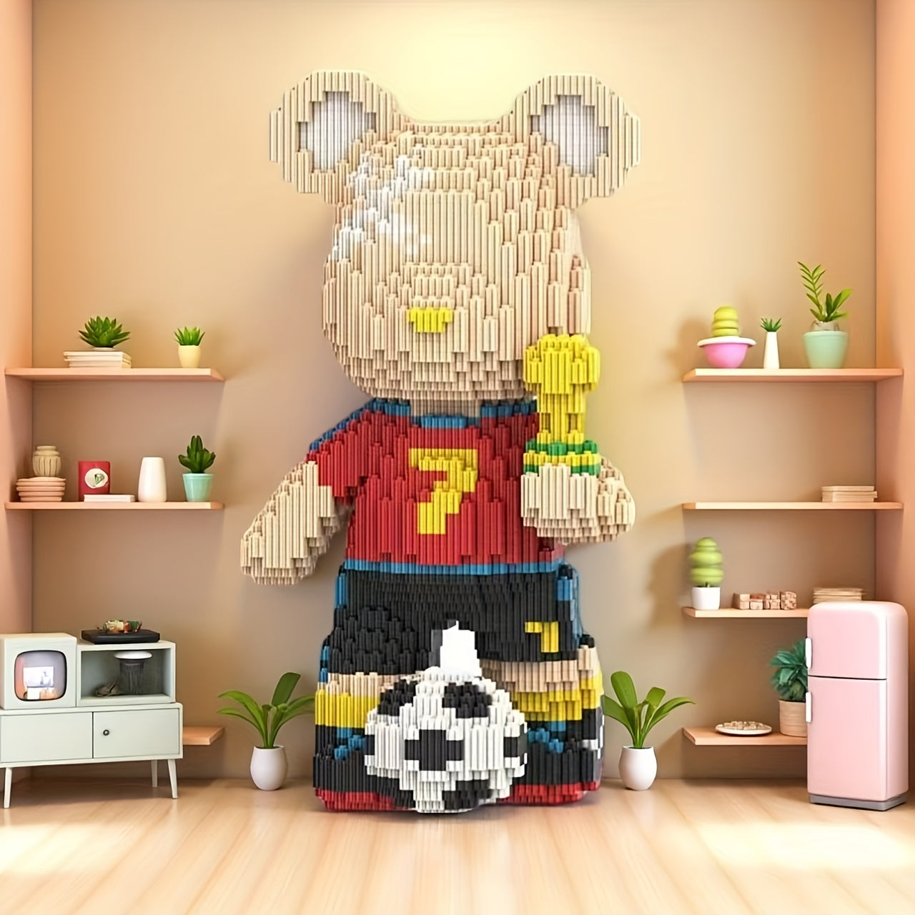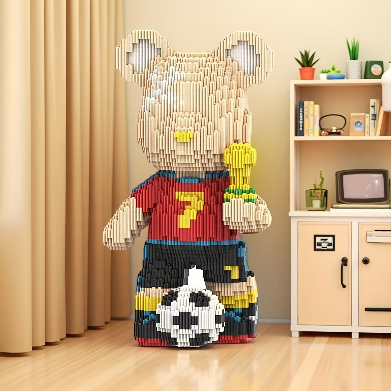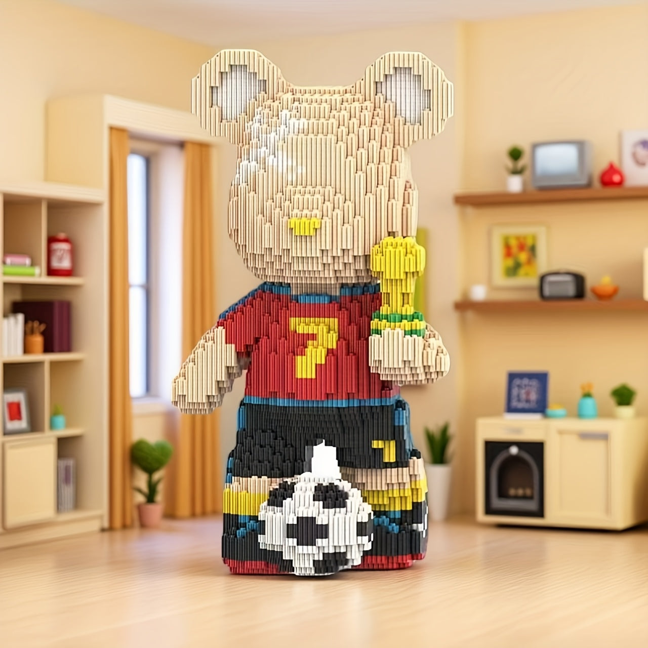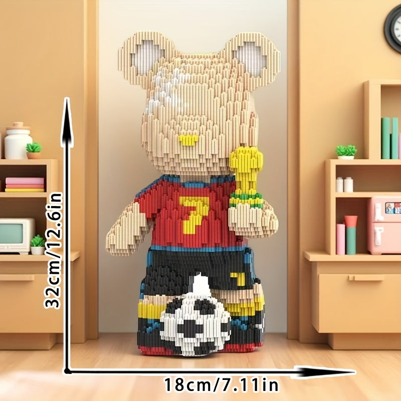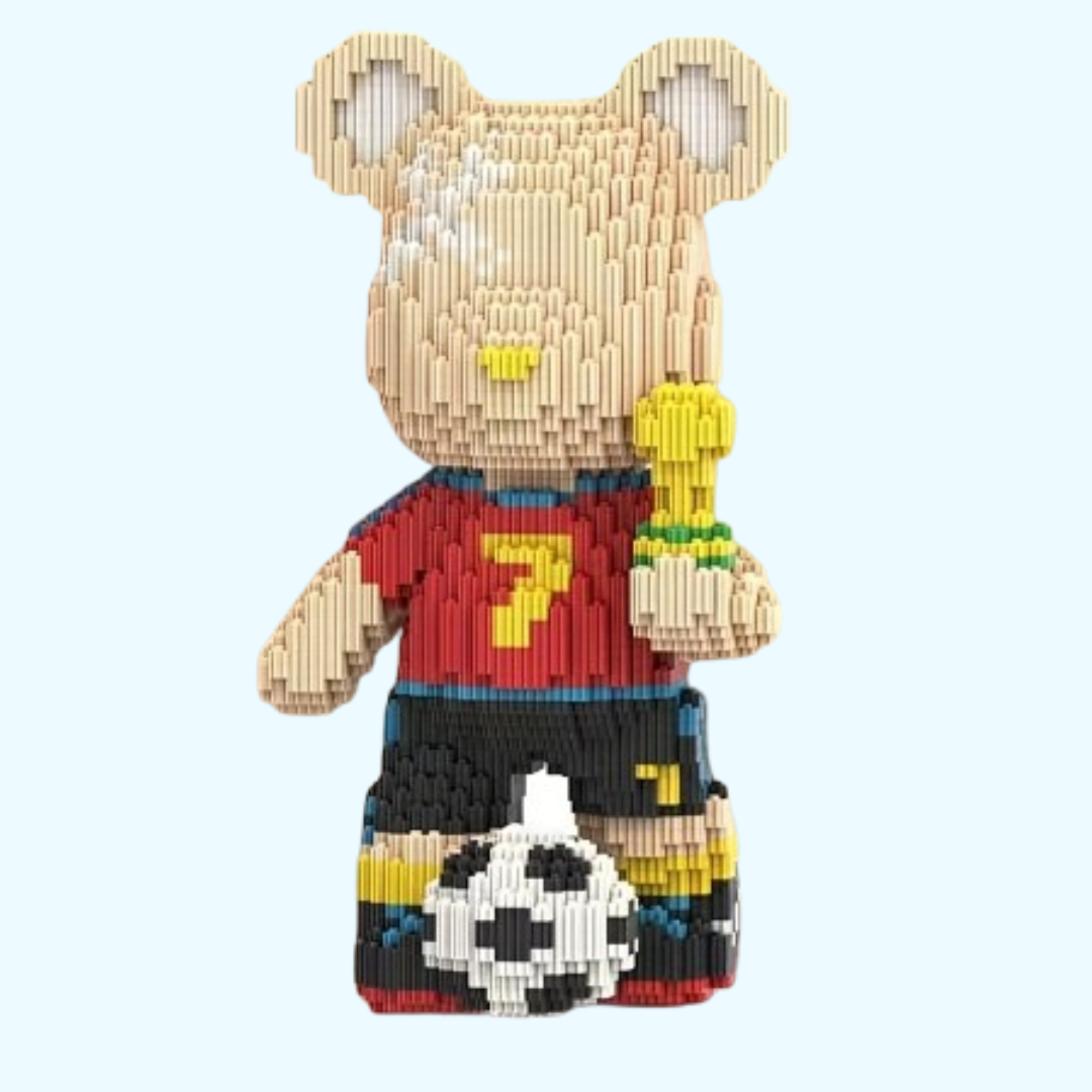 Dieser sportliche Bär hat den Weltpokal schon in seinen Pfoten! Mit der Rückennummer 7 und einem Fußball zu seinen Füßen ist er ein cooler Blickfang für jeden Fußballfan. Ein tolles Bauprojekt zum Spaßhaben und Stolz präsentieren!