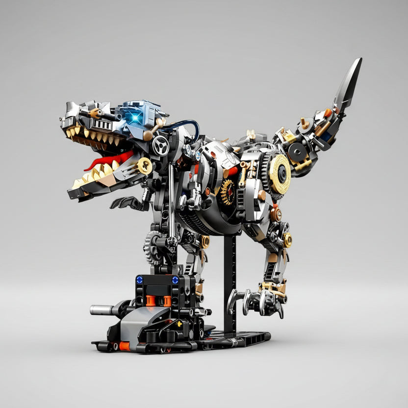 Dieser mechanische Dinosaurier ist ein echter Blickfang. Mit seinen scharfen Zähnen, den robusten Beinen und den sichtbaren Zahnrädern strahlt er pure Kraft aus. Ein cooles Bauprojekt, das Technik und Abenteuer perfekt miteinander verbindet.