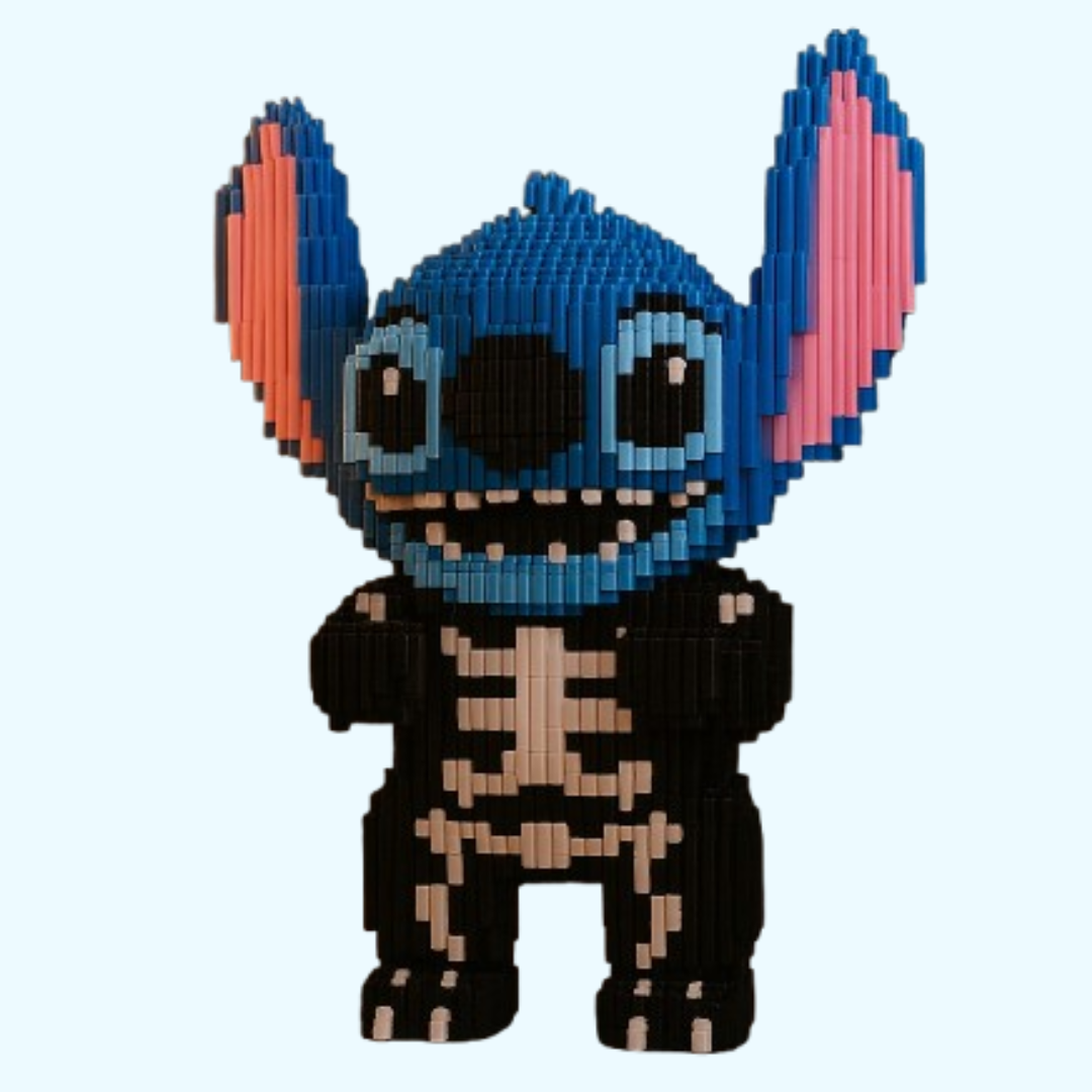 Gruselig spaßig zum Bauen – mit einem Augenzwinkern! Mit seinem breiten Grinsen, den großen Ohren und dem Skelettkostüm ist diese blaue Figur ein echter Halloween-Held. Ein auffälliges Bauprojekt, das perfekt zur schaurigen Jahreszeit passt!