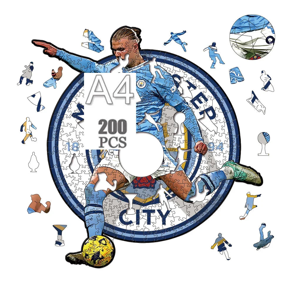 Erlebe Haalands ikonischen Schuss mit diesem wunderschönen 2D-Holzpuzzle. Jedes Puzzleteil bringt dich einem dynamischen Kunstwerk näher – perfekt für echte Fußballfans, City-Supporter und alle, die entspannte, kreative Projekte lieben.