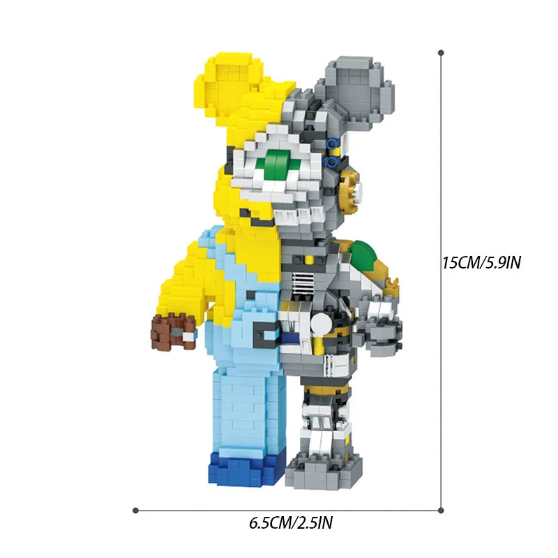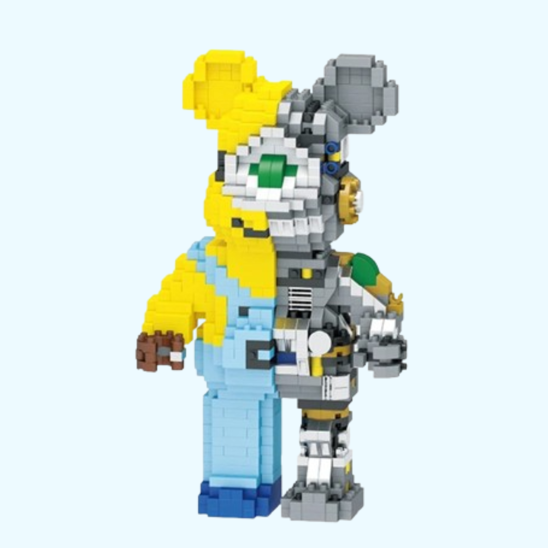 Ein einzigartiges Bausteinset, das zwei Welten vereint: links ein fröhliches Wesen, rechts ein beeindruckender Roboter. Perfekt für alle, die auffällige Kreationen lieben.