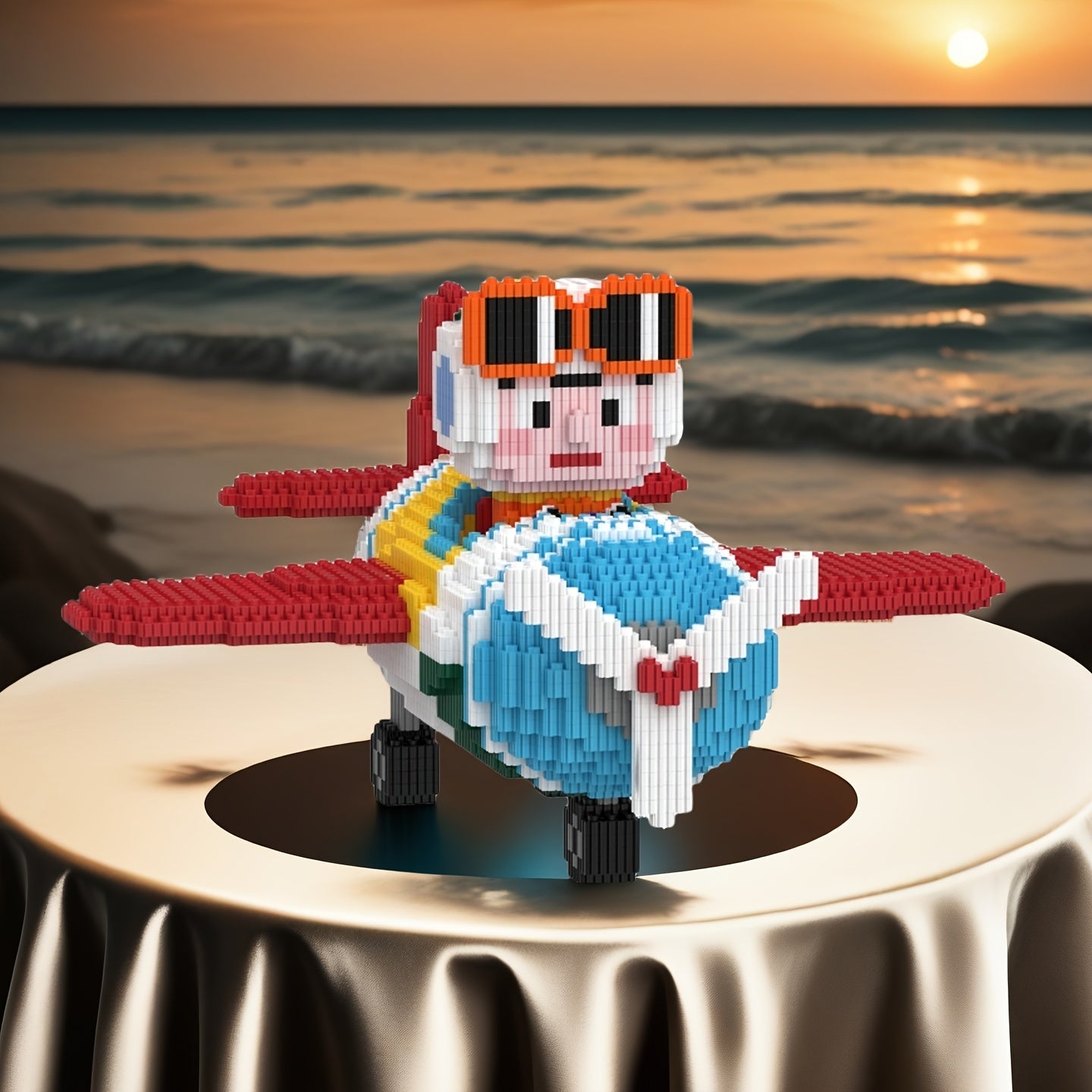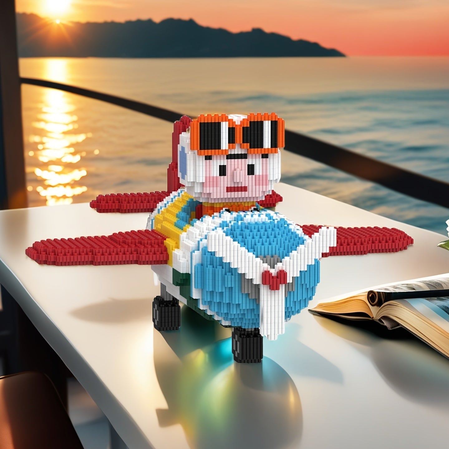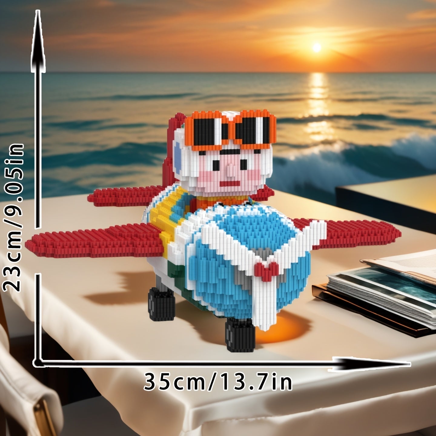 Mit seiner großen orangefarbenen Brille, dem niedlichen Gesicht und dem bunten Flugzeug ist dieser baubare Pilot ein fröhlicher Blickfang für jedes Zimmer.