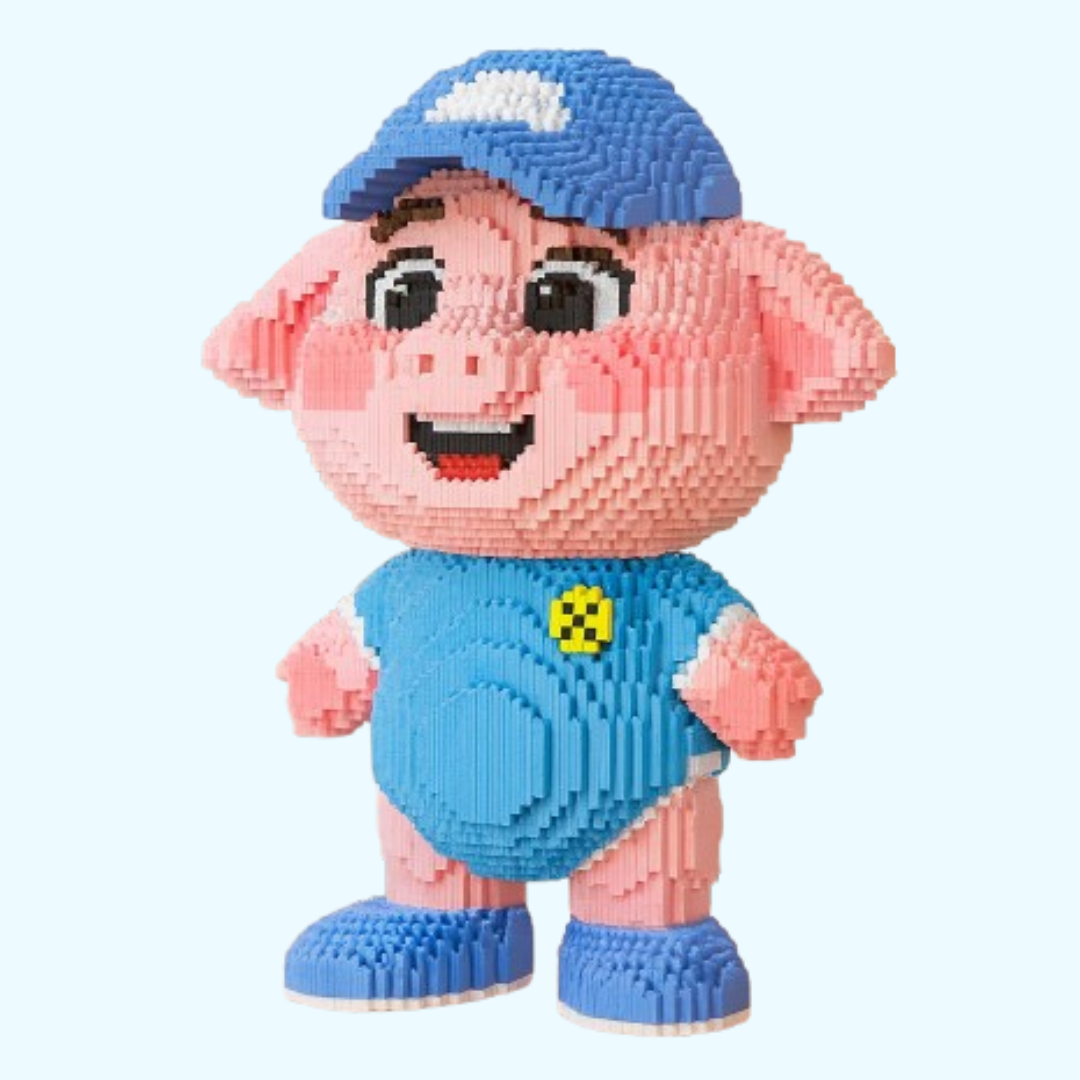 Mit seinem breiten Lächeln, den süßen Ohren und der blauen Mütze ist dieses Schwein ein echter Hingucker. Das farbenfrohe Design macht dieses Bauset ideal als Geschenk – oder einfach zum Selberbauen.