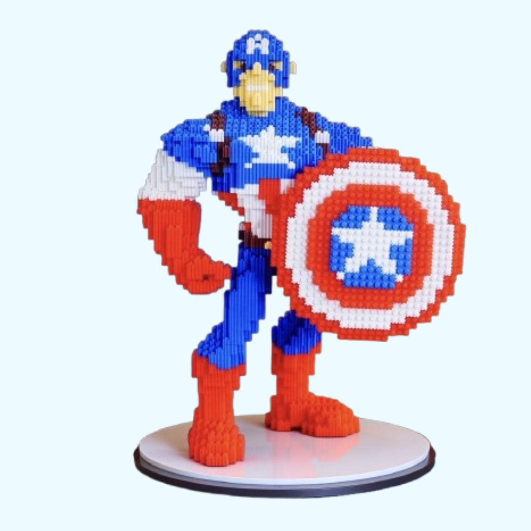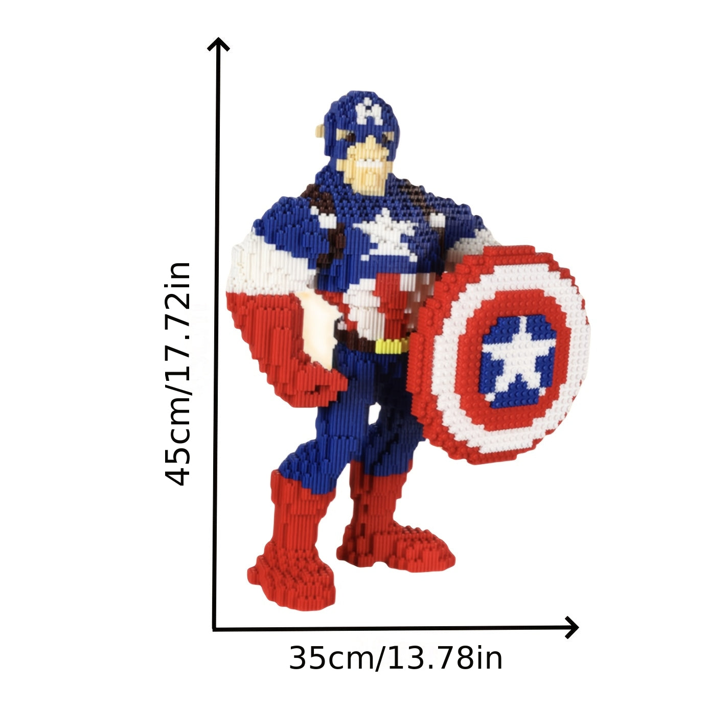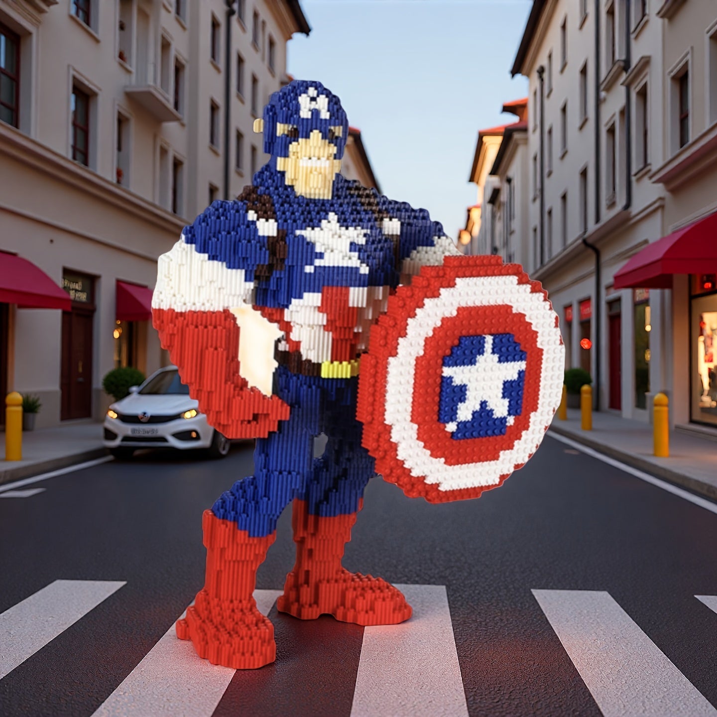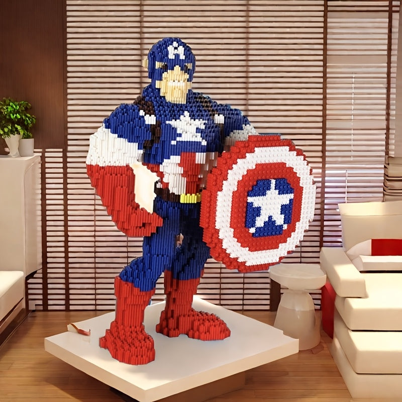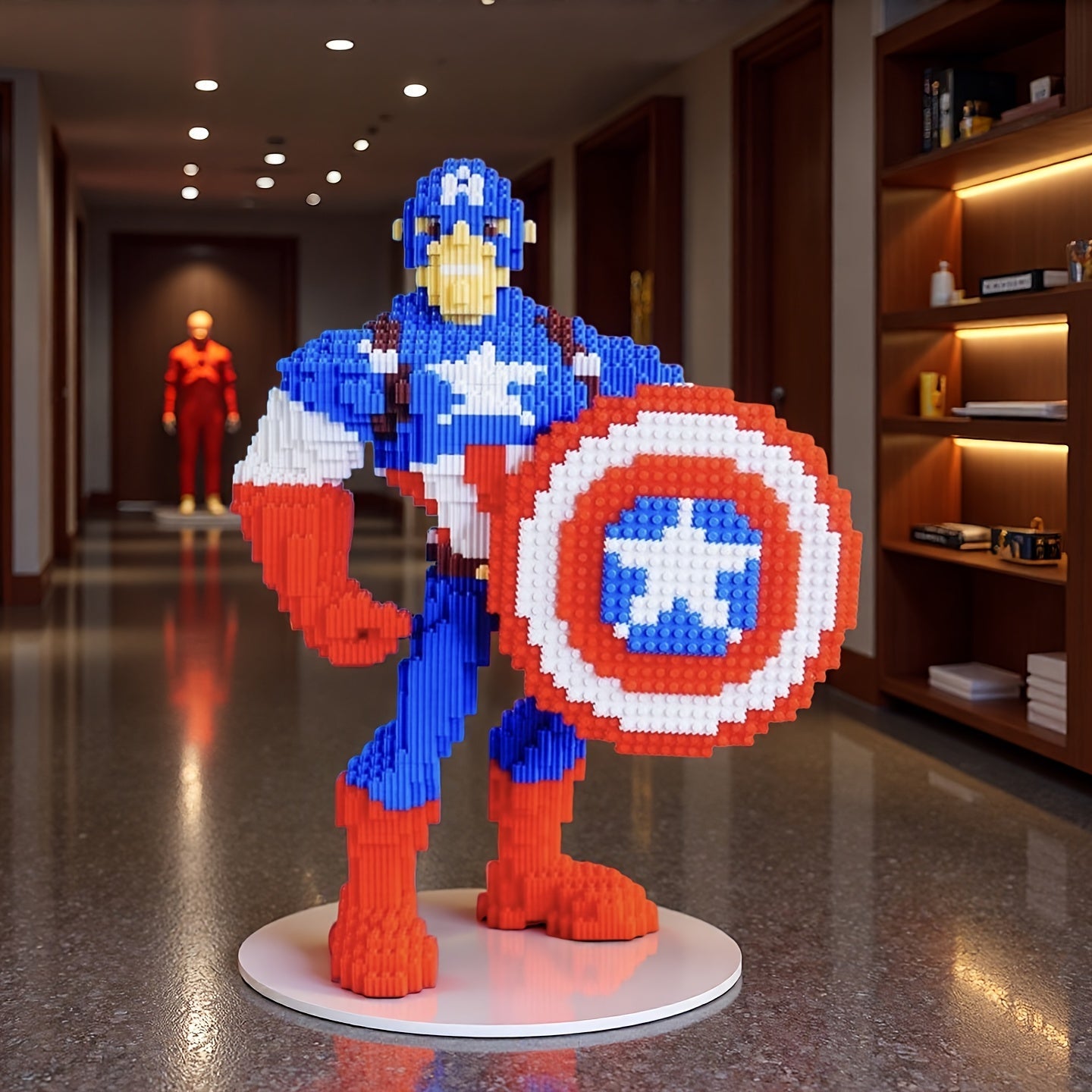Mit seinem ikonischen Schild, der kraftvollen Haltung und dem detailreichen Outfit ist dieser Superheld ein beeindruckender Blickfang in jedem Interieur.